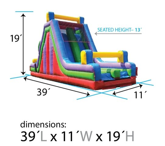 Rainbow 19'H Rock Climb Dry Slidethe best in competitive entertainment for your party or outdoor event. Two contestants can challenge each other to see who can climb up the rock wall and then head down the over 13-foot tall slide the fastest. This huge stand-alone inflatable rock climbing wall and slide tops out at a massive total of 19-feet tall and 40-feet long, so its surely going to be one of the biggest attention-grabbers at your event. It features a bright, gender-neutral, retro color scheme that is eye-catching and appealing to both boys and girls. It is ideal for birthday parties, summer or day camps, field days, youth sports team parties or any outdoor event that would enjoy the fun of an inflatable slide combined with the thrill of competition.