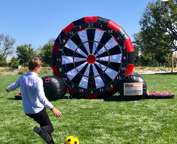 The innovative Multi-Use 10 ft. Soccer Dart with Side Game is always on the mark! This interactive game combines Soccer Dart, Baseball Banner, and Foldable Side Games (Tic Tac Toe & Drinking Game) with an LED Light Pocket into ONE inflatable fun time. The side game can also be folded when space is limited. The Soccer Dart features a removable hook and loop fastener lining, This game is a great addition for corporate events, fundraisers, or backyard events.